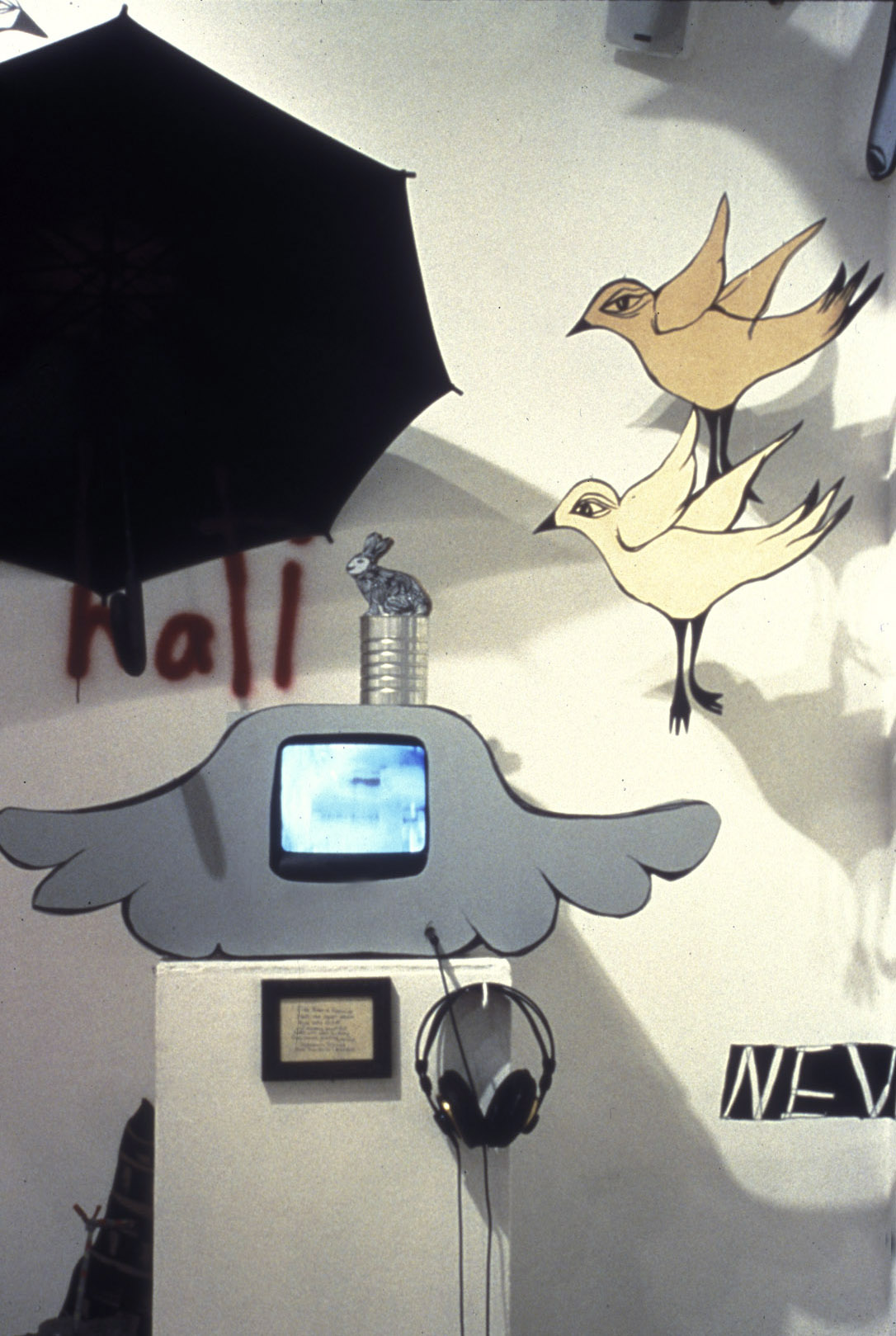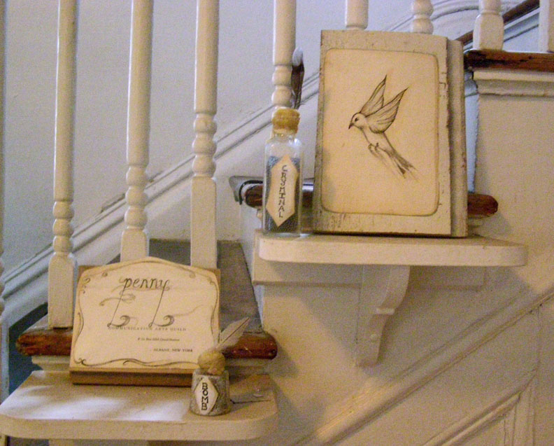 Phantom View of the Mancuso Furniture Showroom, site-specific installation performance created at Intersection for the Arts, San Francisco CA. A wooden chair was suspended in a stairwell where the original floor used to be when the building was a furniture shop. To the right of the chair a mattress was suspended referring to the mattress storage area that once occupied that space. Video of the San Francisco earthquake superimposed with brances and crows was projected behind the chair. A six hour performance occured in the chair, dangling over a 10 ft, two storey stairwell. Viewers entered the stairwell through an installation of architectural windows, wood and hand carved signs.