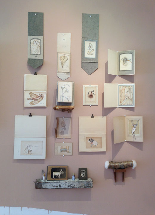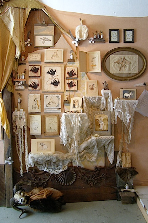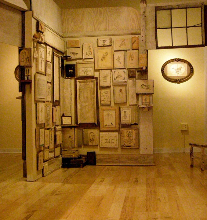 Mixed media drawings mounted on found wood with teabags, video, sound and other objects. Installed at Pan American Art Projects, Miami FL., Anno Domini Gallery, San Jose, CA & SUNY Art Museum, Albany NY.