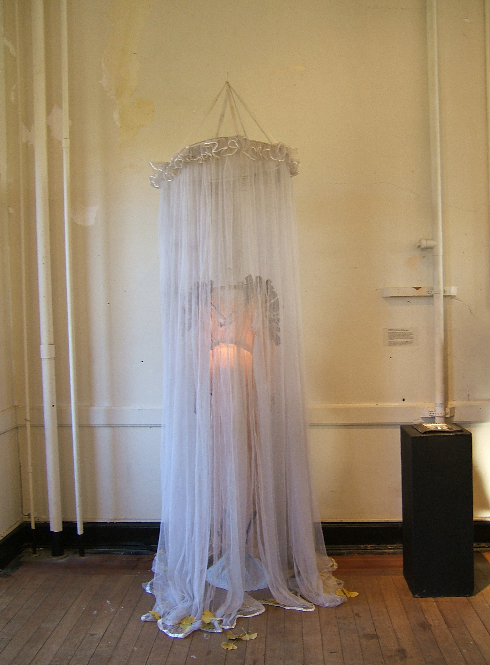 Mixed-media installation with drawings, objects, garments, props, sound and video responding to the military history of Governors Island in the New York Harbor. Suggestions of post-military violence and flight filled two stories of this family home on Colonels Row. Open birdcages exhibited throughout the house echoed the military prisons once located on the now public island. Recorded names of women and children from cemetary records resonated through the bedrooms, along with other recorded texts. 7 days of duration performances were staged amidst the installation, wherein 32 goose feathers were stitched into my skin. The final performance occurred in a tree, located in front of the house